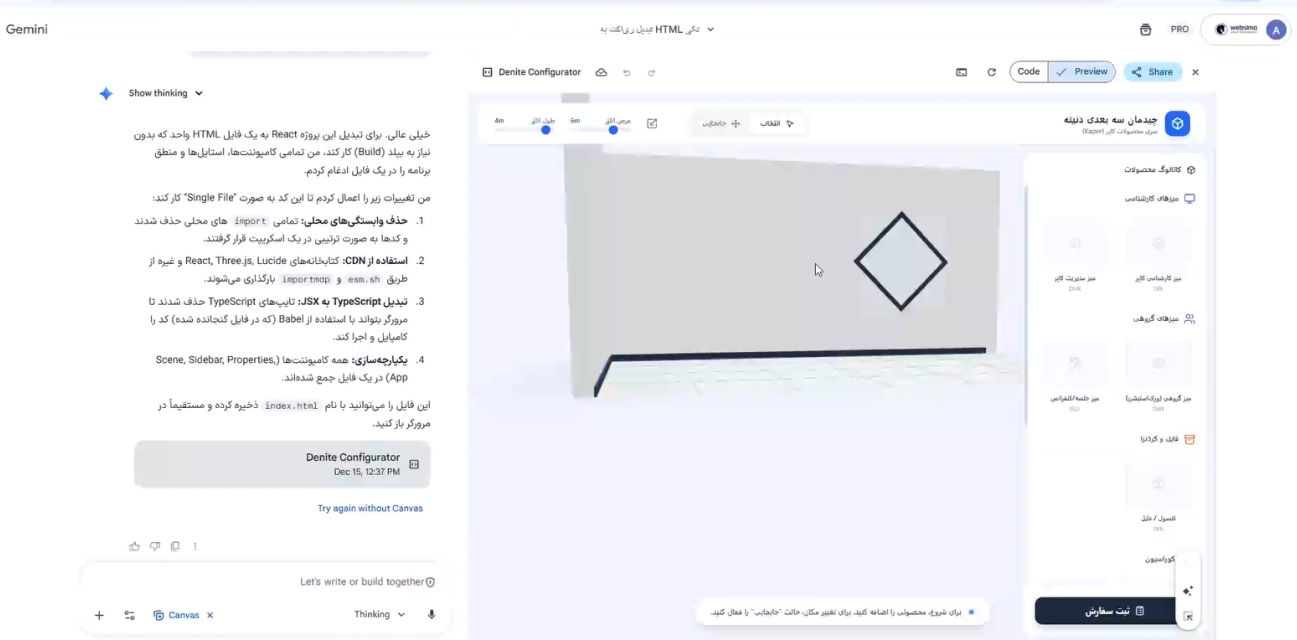 در این بخش، سراغ تبدیل خروجی پروژه میرویم و یاد میگیریم چطور از Gemini برای آمادهسازی آن جهت استفاده در سایت استفاده کنیم. خروجی پروژه که با React ساخته شده است را به هوش مصنوعی میدهیم تا آن را به HTML قابل استفاده در وبسایت تبدیل کند. هدف این ویدیو این است که نشان بدهیم هوش مصنوعی فقط در مرحله ایده یا طراحی متوقف نمیشود و میتواند بهصورت عملی، فاصله بین توسعه و اجرا را کم کند؛ بهطوری که خروجی یک پروژه تعاملی بهراحتی قابل قرار دادن و استفاده در سایت باشد.